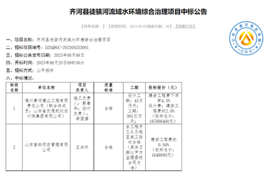 公司中標(biāo)齊河縣徒駭河流域水環(huán)境綜合治理項(xiàng)目