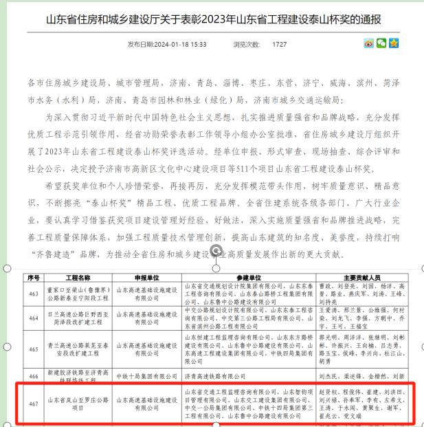 嵐羅高速項目榮獲2023年度“山東省工程建設(shè)泰山杯獎”